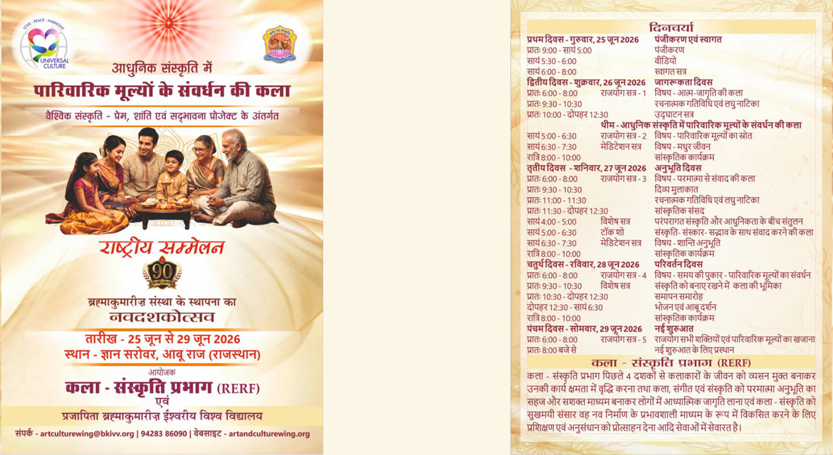 कला एवं संस्कृति के क्षेत्र से जुड़े हुए विशिष्ट विभूतियों को एक मंच पर लाकर आध्यात्मिकता, मूल्यों एवं सांस्कृतिक चेतना का संवर्धन करने हेतु दिनांक 25 जून से 29 जून तक “आधुनिक संस्कृति में पारिवारिक मूल्यों के संवर्धन की कला” इस विषय पर ज्ञान सरोवर, आबू राज (राजस्थान) में राष्ट्रीय सम्मेलन का आयोजन।